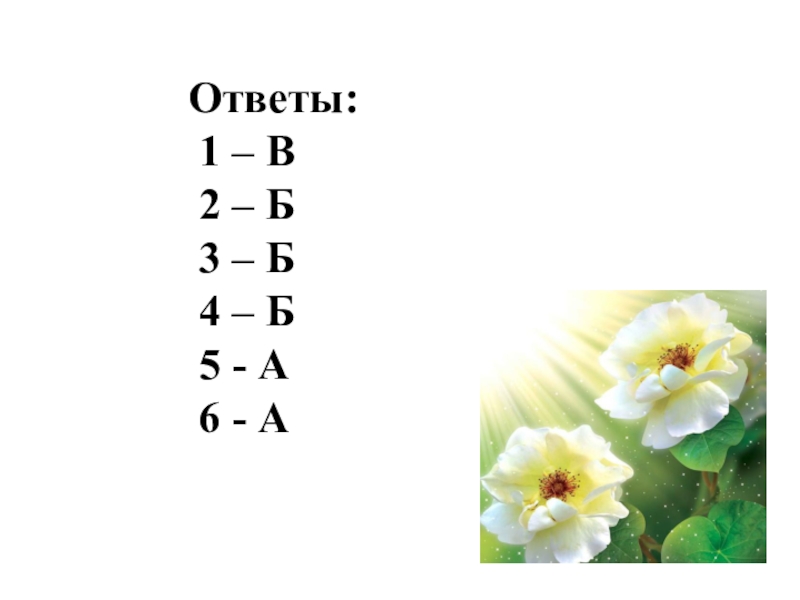 Ответы: 1 – В  2 – Б   3 – Б 4 – Б 5