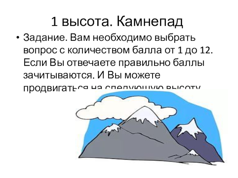 1 высота. Камнепад  Задание. Вам необходимо выбрать вопрос с количеством балла от 1 до 12.