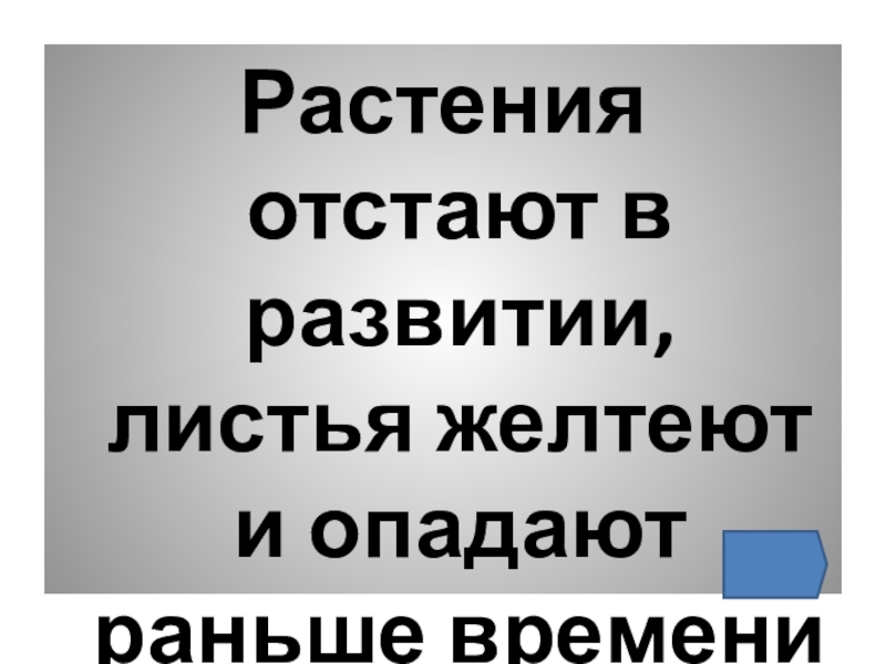 Слайд 20Растения отстают в развитии, листья желтеют и опадают раньше времени