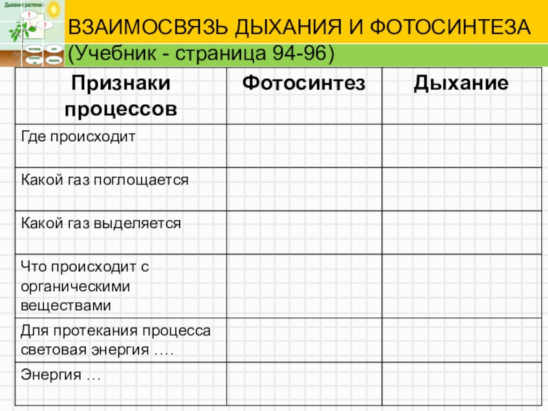 ВЗАИМОСВЯЗЬ ДЫХАНИЯ И ФОТОСИНТЕЗА (Учебник - страница 94-96)