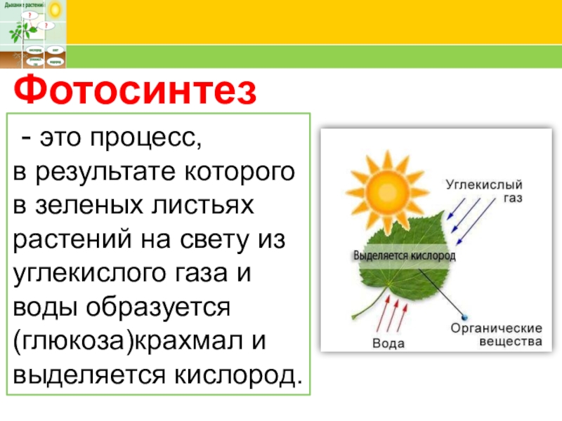 Фотосинтез - это процесс, в результате которого в зеленых листьях растений на свету из углекислого газа и