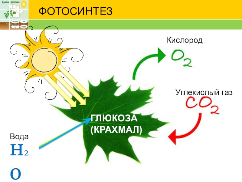 ФОТОСИНТЕЗн2оГЛЮКОЗА(КРАХМАЛ)Углекислый газКислородВода
