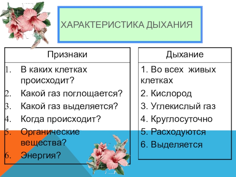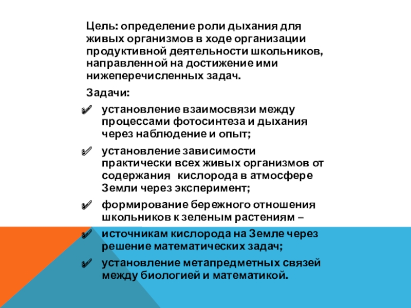 Цель: определение роли дыхания для живых организмов в ходе организации продуктивной деятельности школьников, направленной на достижение ими