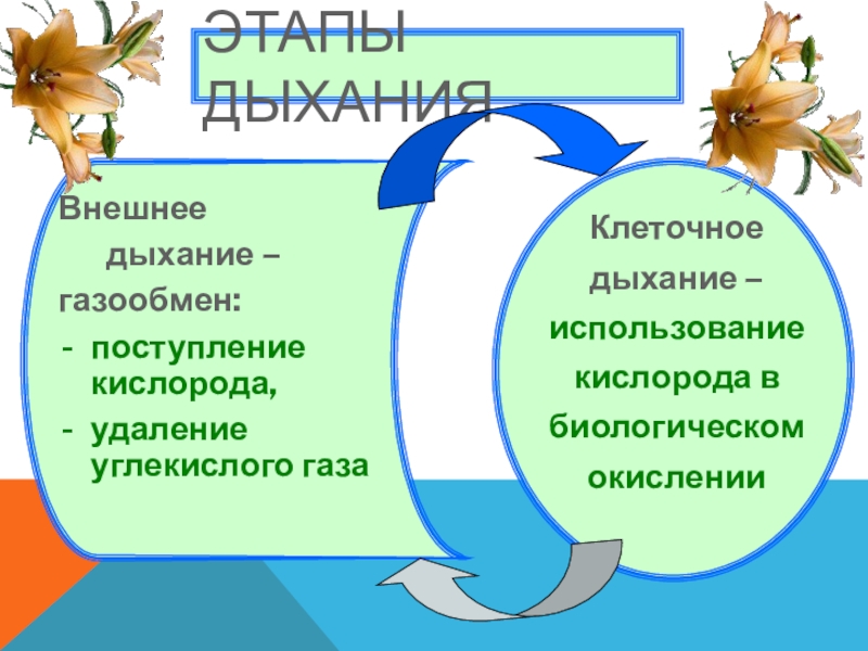 Этапы дыханияВнешнее    дыхание – газообмен: поступление кислорода, удаление углекислого газа Клеточное дыхание –использованиекислорода в