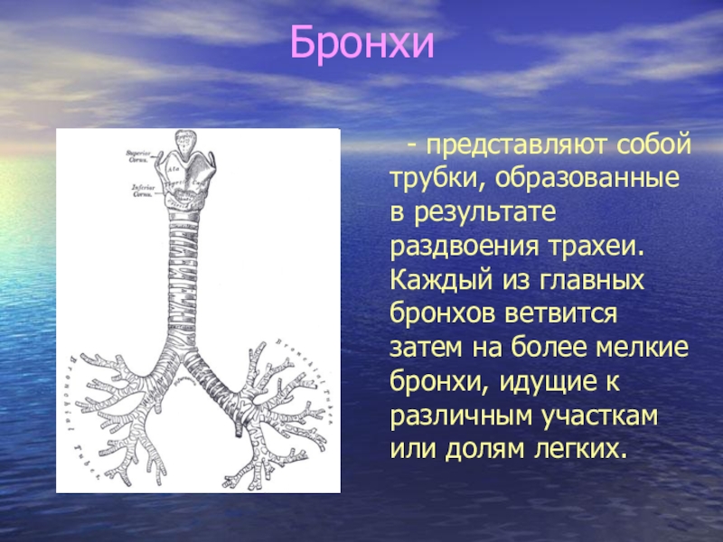 трахеи. Каждый из главных бронхов ветвится затем на более мелкие бронхи, идущие к различным участкам или долям легких.