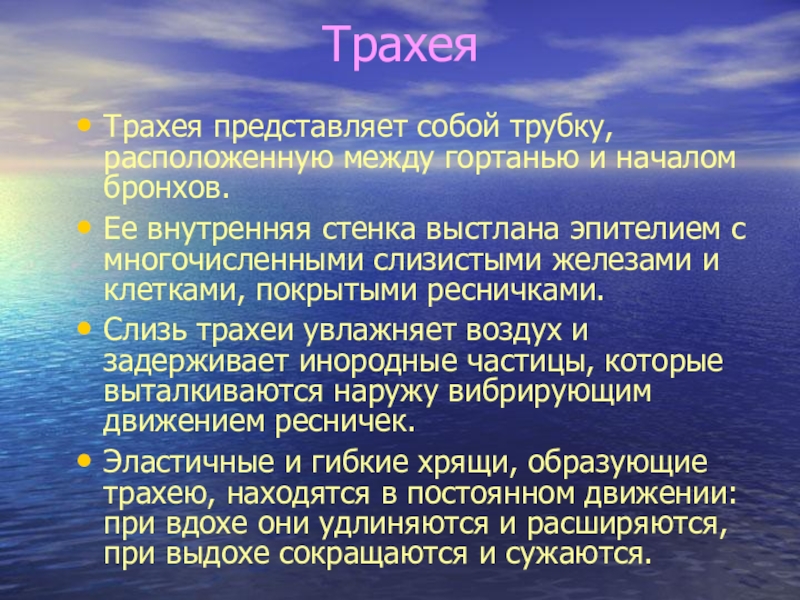 Слизь трахеи увлажняет воздух и задерживает инородные частицы, которые выталкиваются наружу вибрирующим движением ресничек.