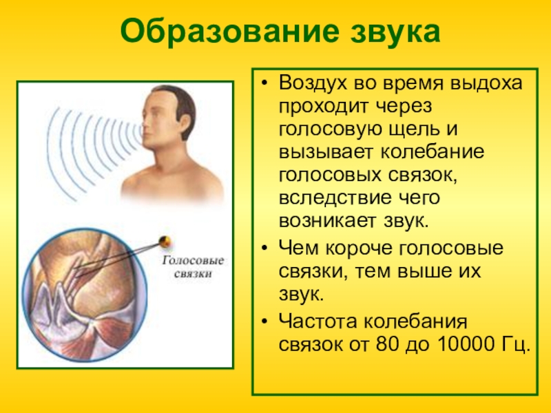 Образование звукаВоздух во время выдоха проходит через голосовую щель и вызывает колебание голосовых связок, вследствие чего возникает