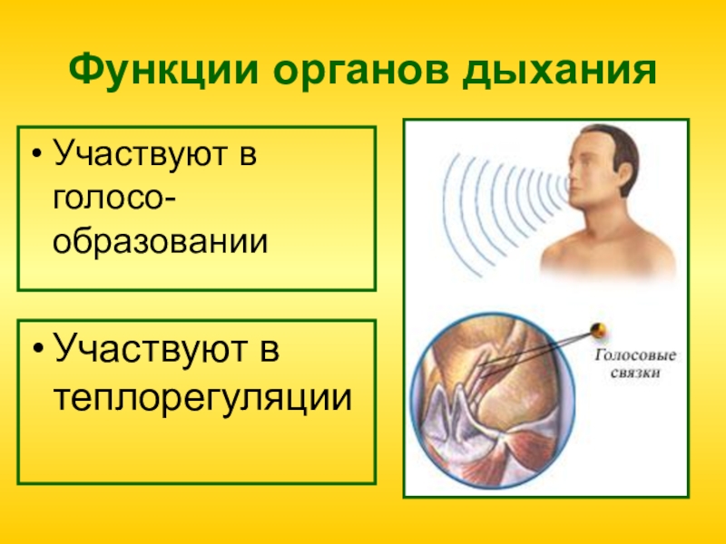 Функции органов дыханияУчаствуют в голосо-образованииУчаствуют в теплорегуляции