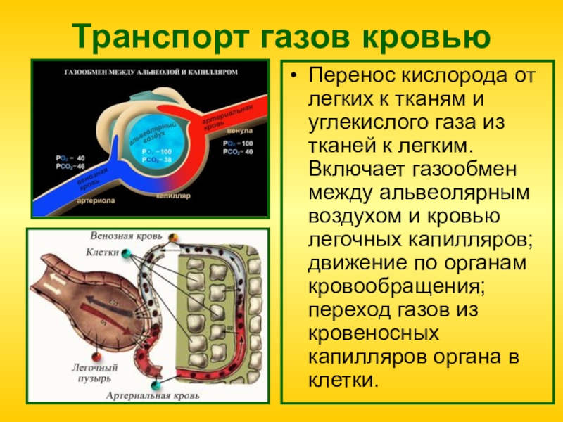 Транспорт газов кровьюПеренос кислорода от легких к тканям и углекислого газа из тканей к легким. Включает газообмен