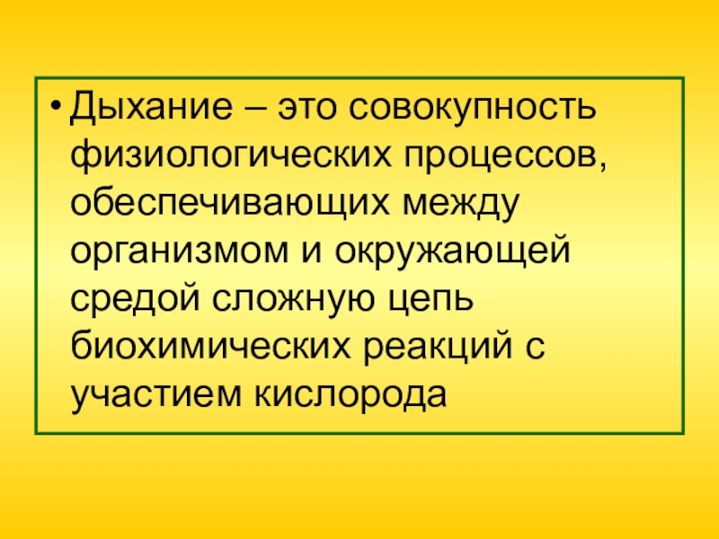 Дыхание – это совокупность физиологических процессов, обеспечивающих между организмом и окружающей средой сложную цепь биохимических реакций с участием кислорода