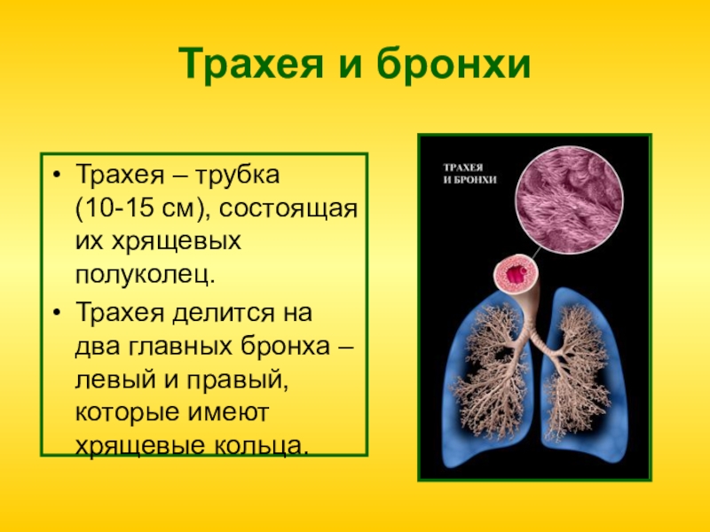 Трахея и бронхиТрахея – трубка (10-15 см), состоящая их хрящевых полуколец.Трахея делится на два главных бронха –
