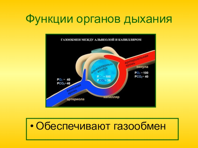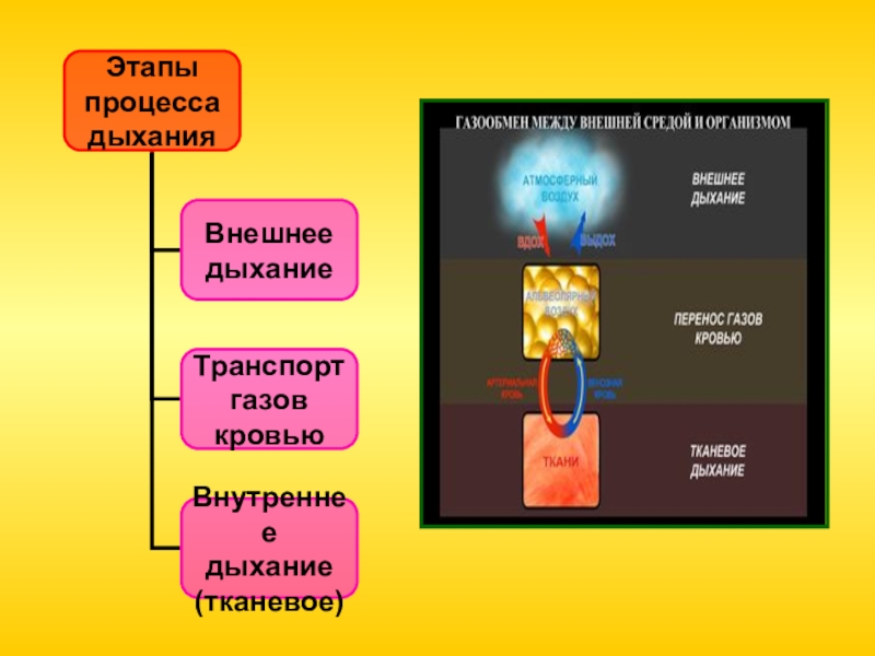 из тканей к легким. Включает газообмен между альвеолярным воздухом и кровью легочных капилляров; движение по органам кровообращения; переход газов из кровеносных капилляров органа в клетки.