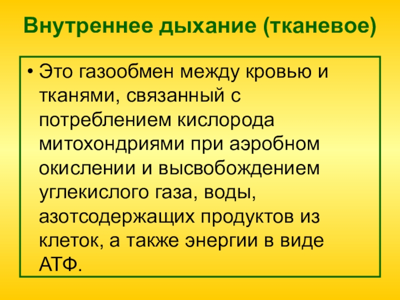 Внутреннее дыхание (тканевое)Это газообмен между кровью и тканями, связанный с потреблением кислорода митохондриями при аэробном окислении и