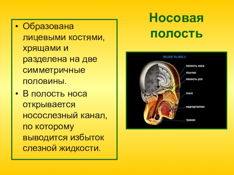 Носовая полостьОбразована лицевыми костями, хрящами и разделена на две симметричные половины.В полость носа открывается носослезный канал, по