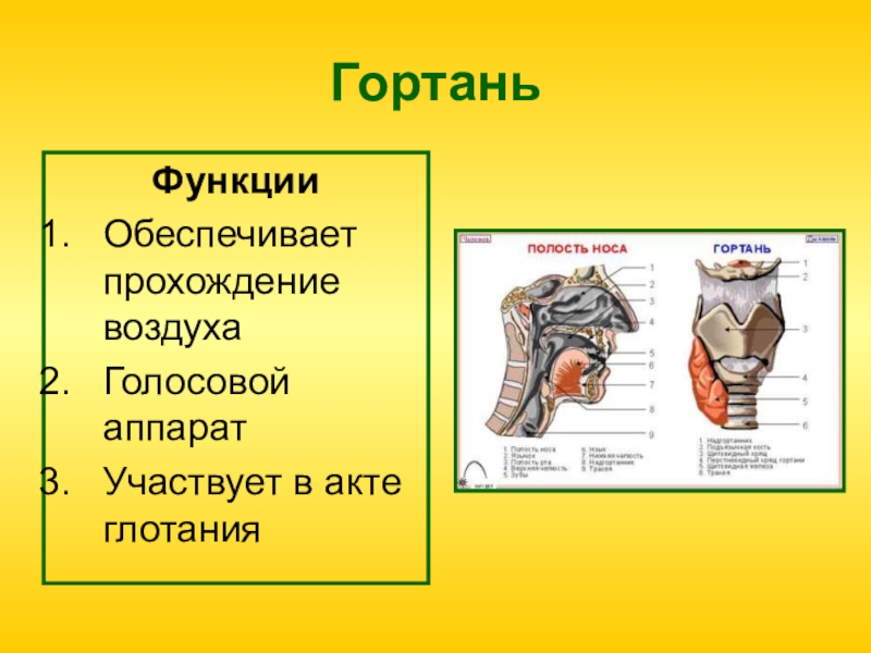 ГортаньФункцииОбеспечивает прохождение воздухаГолосовой аппаратУчаствует в акте глотания