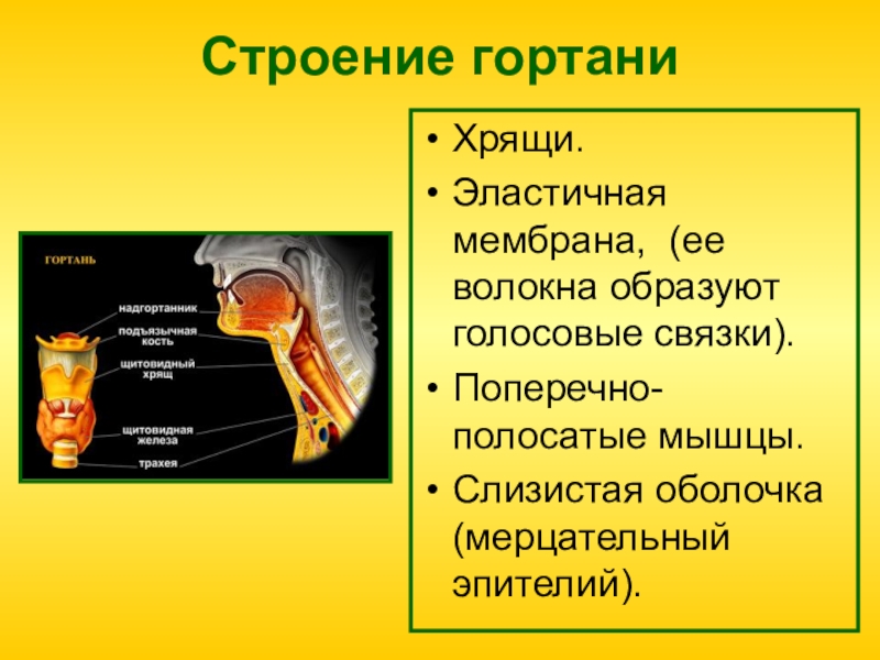 Строение гортаниХрящи.Эластичная мембрана, (ее волокна образуют голосовые связки).Поперечно-полосатые мышцы.Слизистая оболочка (мерцательный эпителий).