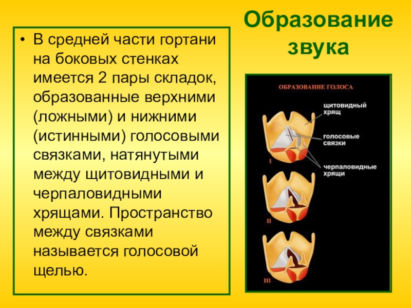 Образование звукаВ средней части гортани на боковых стенках имеется 2 пары складок, образованные верхними (ложными) и нижними