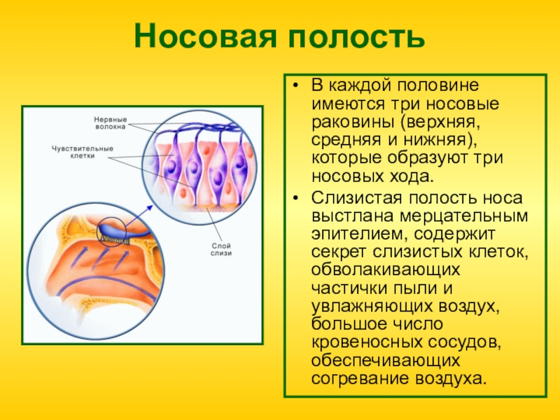 Слизистая полость носа выстлана мерцательным эпителием, содержит секрет слизистых клеток, обволакивающих частички пыли и увлажняющих воздух, большое число кровеносных сосудов, обеспечивающих согревание воздуха.