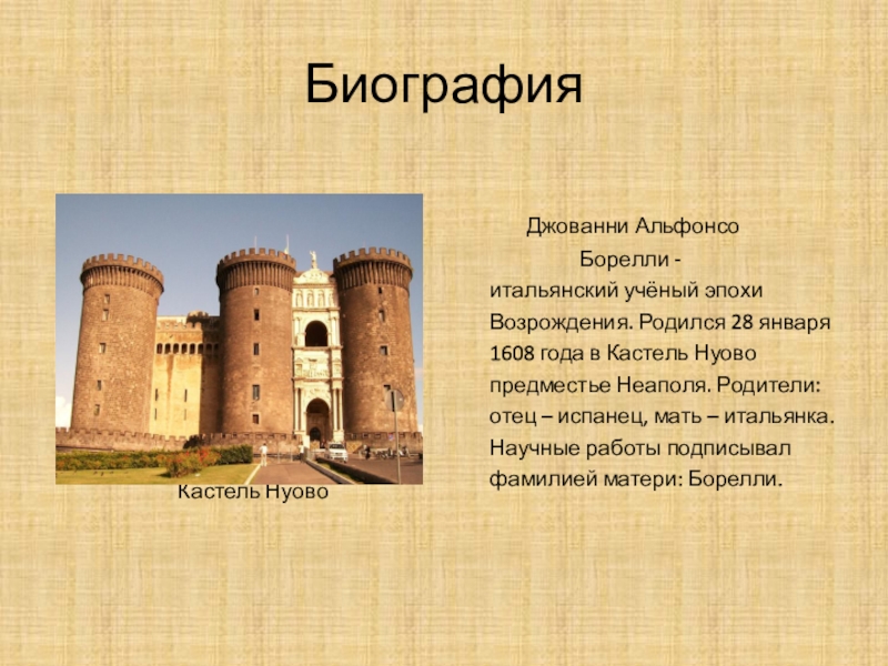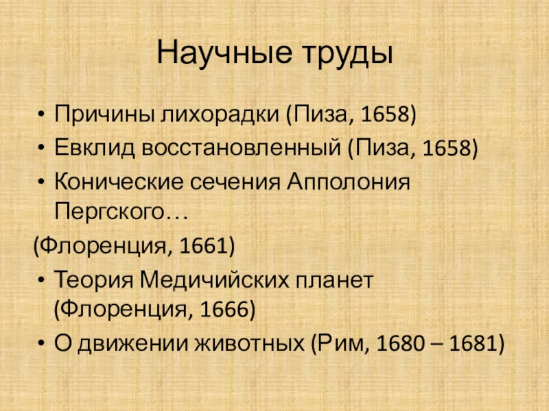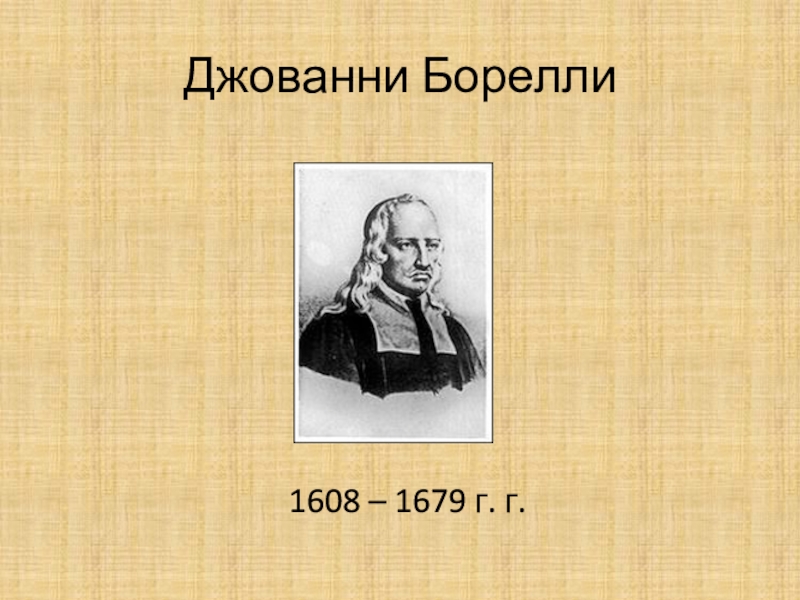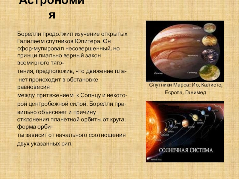 Борелли продолжил изучение открытых Галилеем спутников Юпитера. Он сфор-мулировал несовершенный, но принци-пиально верный закон всемирного тяго-