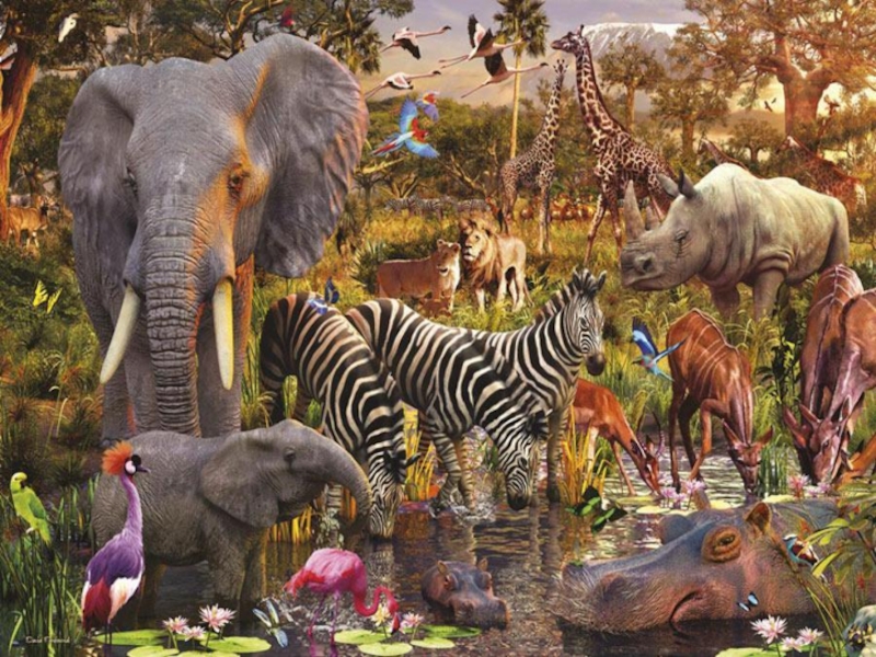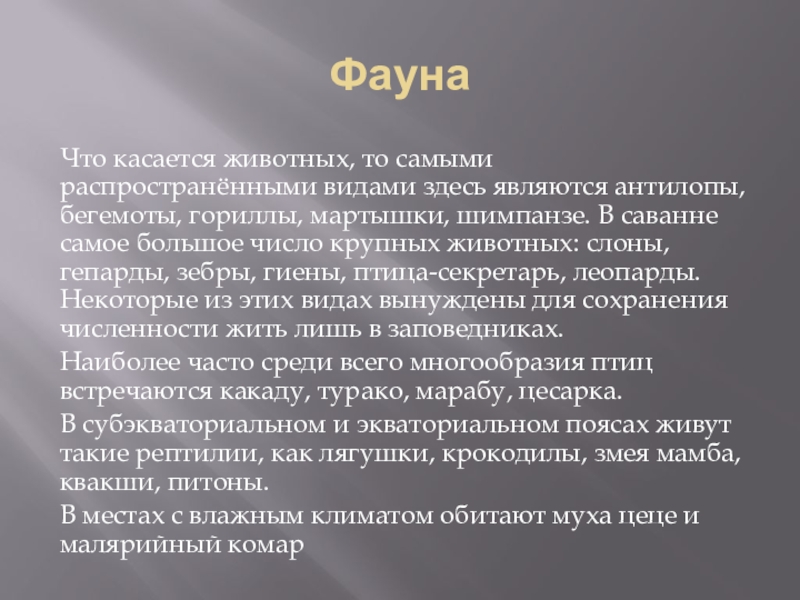 гориллы, мартышки, шимпанзе. В саванне самое большое число крупных животных: слоны, гепарды, зебры, гиены, птица-секретарь, леопарды. Некоторые из этих видах вынуждены для сохранения численности жить лишь в заповедниках.