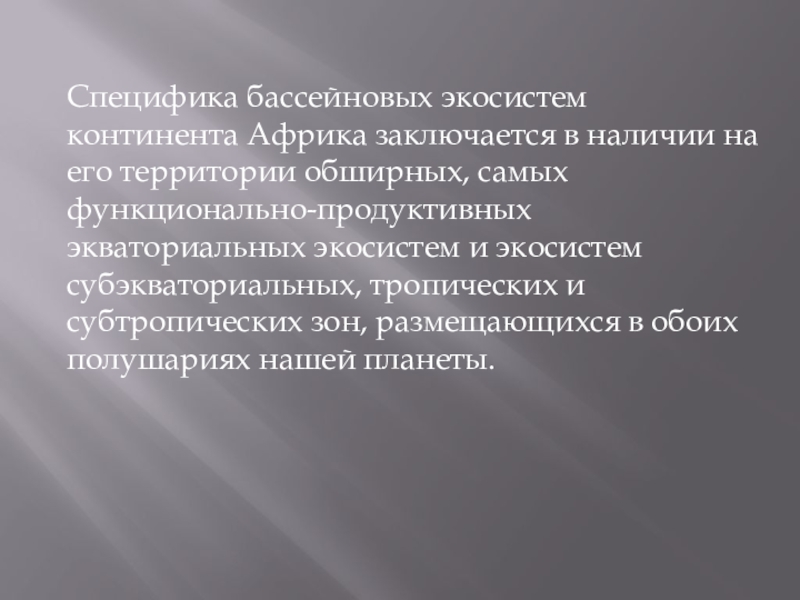 Специфика бассейновых экосистем континента Африка заключается в наличии на его территории обширных, самых функционально-продуктивных экваториальных экосистем и