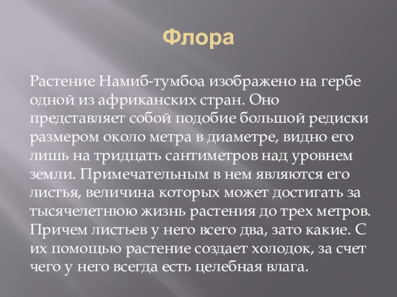 ФлораРастение Намиб-тумбоа изображено на гербе одной из африканских стран. Оно представляет собой подобие большой редиски размером около