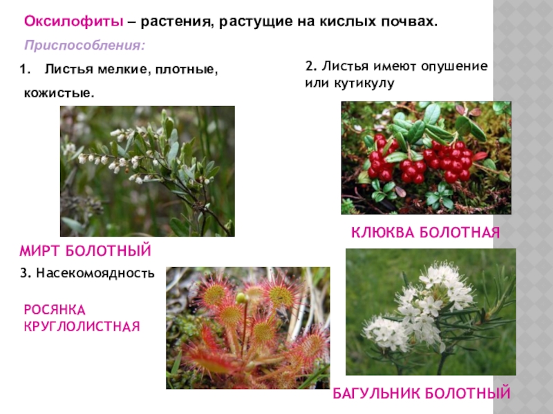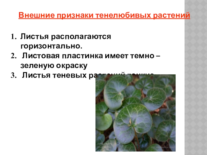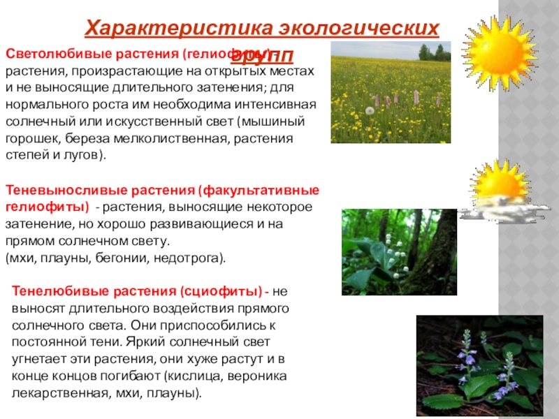 Тенелюбивые растения (сциофиты) - не выносят длительного воздействия прямого солнечного света. Они приспособились к постоянной тени. Яркий солнечный свет угнетает эти растения, они хуже растут и в конце концов погибают (кислица, вероника лекарственная, мхи, плауны).
