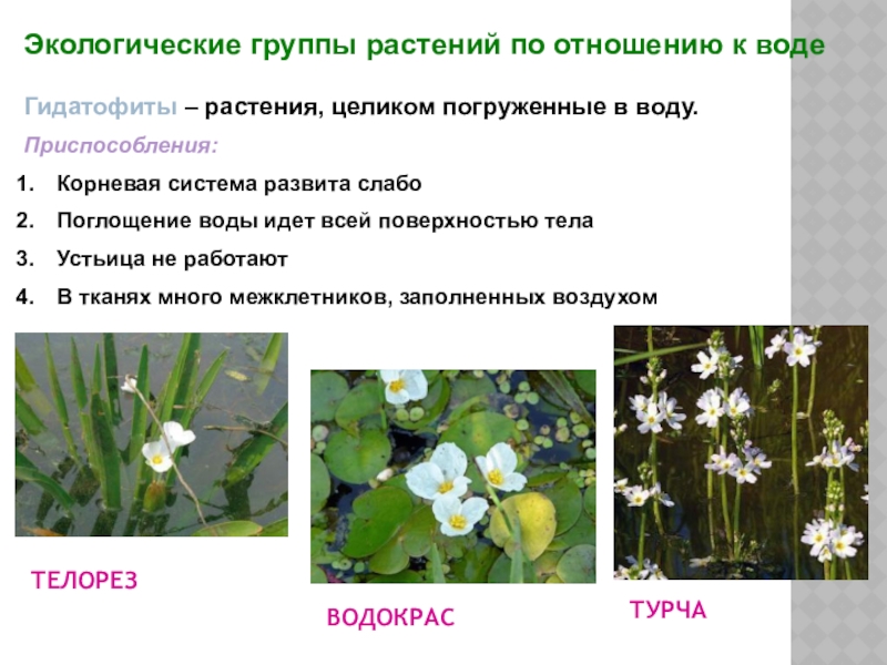 По отношению к водному режиму определяют экологические группы растений и животных: