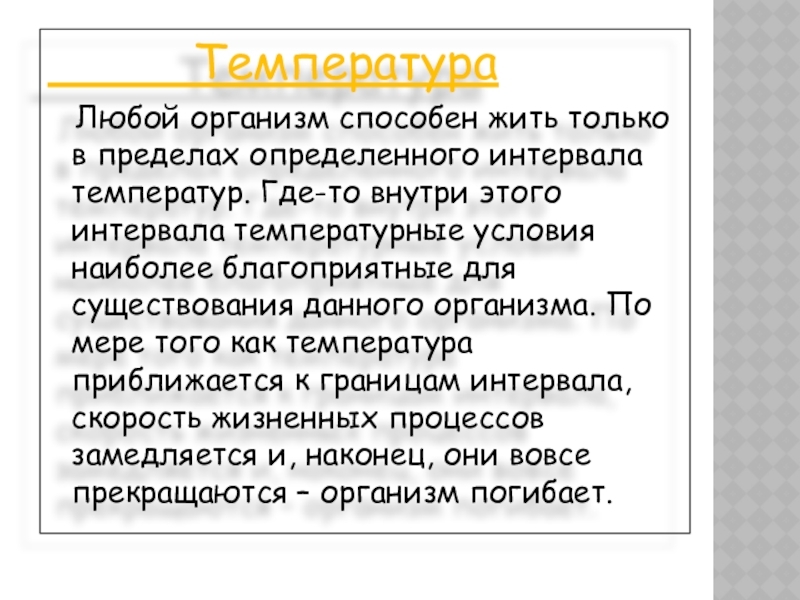 = пойкилотермные – организмы с неустойчивым уровнем обмена веществ, непостоянной температурой тела. Интенсивность обмена веществ прямо пропорциональна внешней температуре.