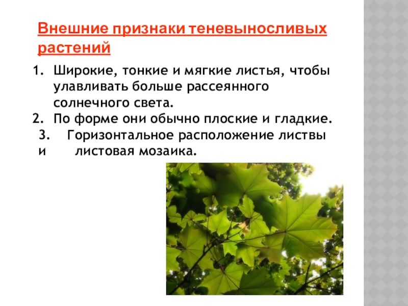Теневыносливые растения (факультативные гелиофиты) - растения, выносящие некоторое затенение, но хорошо развивающиеся и на прямом солнечном свету.