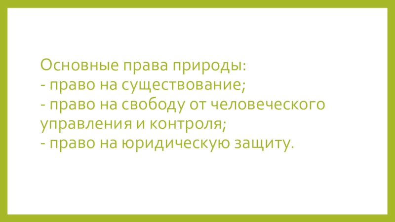 Основные права природы: - право на существование; - право на свободу от человеческого управления и контроля; -