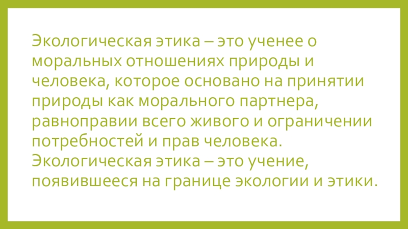 Экологическая этика – это ученее о моральных отношениях природы и человека, которое основано на принятии природы как морального партнера, равноправии всего живого и ограничении потребностей и прав человека. Экологическая этика – это учение, появившееся на границе