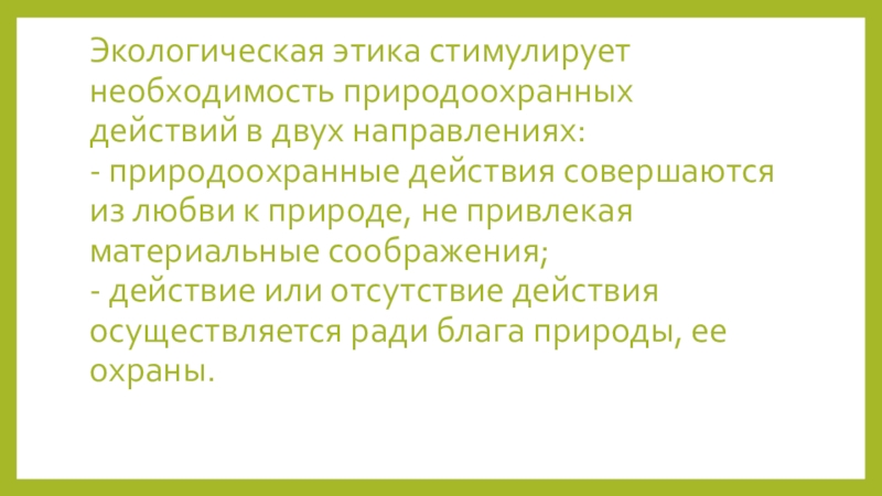 Экологическая этика стимулирует необходимость природоохранных действий в двух направлениях: - природоохранные действия совершаются из любви к природе,