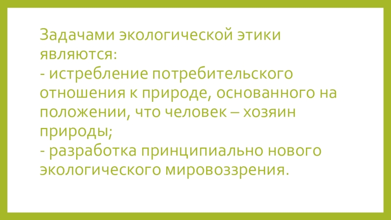 Слайд 6Задачами экологической этики являются: - истребление потребительского отношения к природе, основанного на