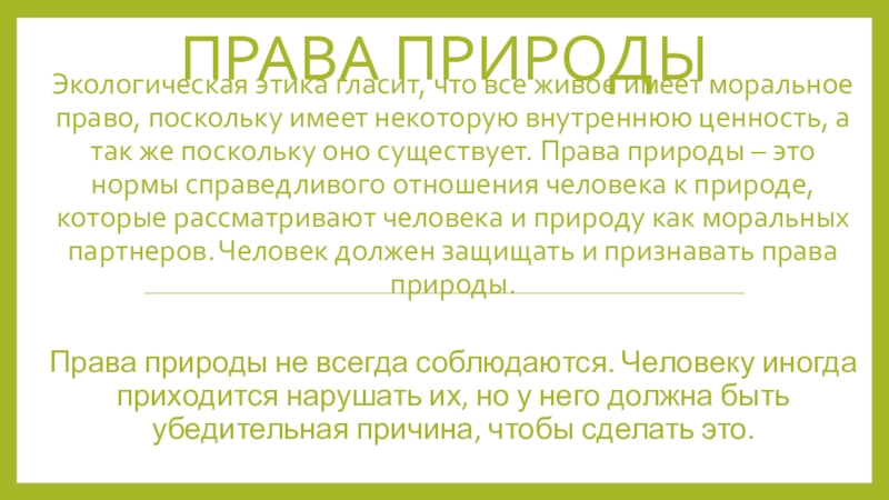 ПРАВА ПРИРОДЫЭкологическая этика гласит, что все живое имеет моральное право, поскольку имеет некоторую внутреннюю ценность, а так