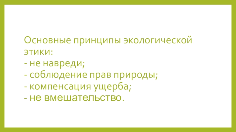 Основные принципы экологической этики: - не навреди; - соблюдение прав природы; - компенсация ущерба; - не вмешательство.