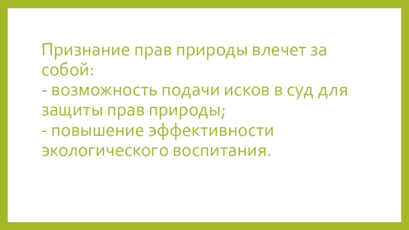 Слайд 8Признание прав природы влечет за собой: - возможность подачи исков в суд