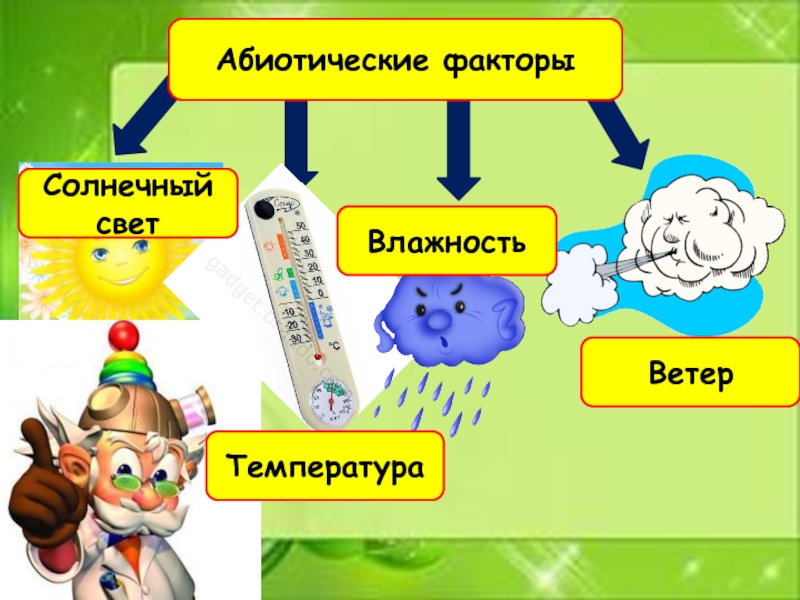 Абиотические факторыСолнечный свет Температура Влажность Ветер