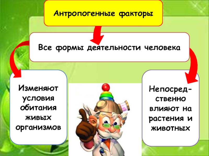 Изменяют условия обитания живых организмов Непосред-ственно влияют на растения и животныхВсе формы деятельности человекаАнтропогенные факторы
