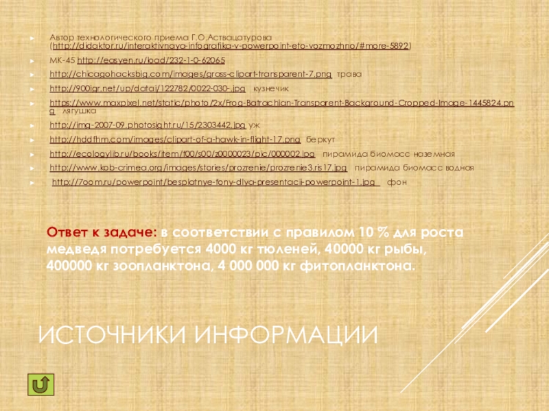 Ответ к задаче: в соответствии с правилом 10 % для роста медведя потребуется 4000 кг тюленей, 40000 кг рыбы, 400000 кг зоопланктона, 4 000 000 кг фитопланктона.