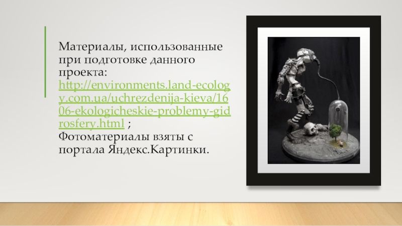 Слайд 9Материалы, использованные при подготовке данного проекта: http://environments.land-ecology.com.ua/uchrezdenija-kieva/1606-ekologicheskie-problemy-gidrosfery.html ;