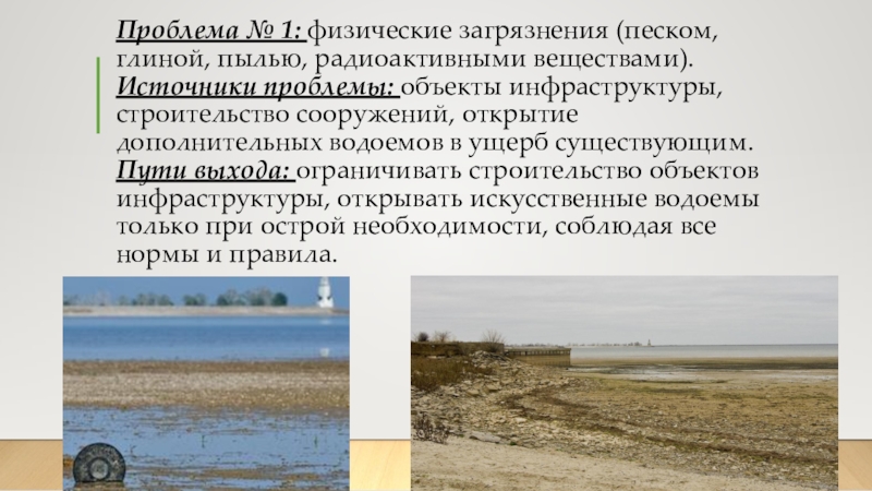 Слайд 3Проблема № 1: физические загрязнения (песком, глиной, пылью, радиоактивными веществами).