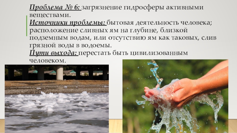 Слайд 8Проблема № 6: загрязнение гидросферы активными веществами.