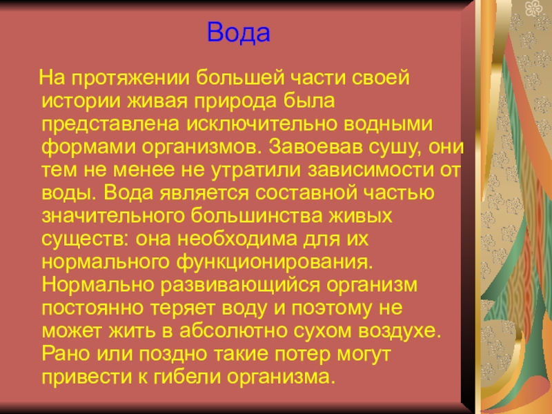 представлена исключительно водными формами организмов. Завоевав сушу, они тем не менее не утратили зависимости от воды. Вода является составной частью значительного большинства живых существ: она необходима для их нормального функционирования. Нормально развивающийся организм постоянно теряет воду и поэтому не может жить в абсолютно сухом воздухе. Рано или поздно такие потер могут привести к гибели организма.