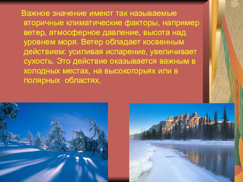 Важное значение имеют так называемые вторичные климатические факторы, например