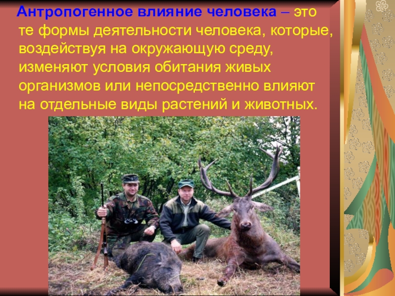 Слайд 6 Антропогенное влияние человека – это те формы деятельности человека,