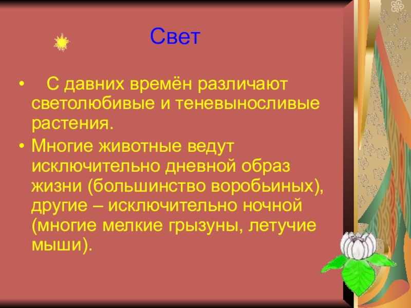 Слайд 11 С давних времён различают светолюбивые и теневыносливые растения.