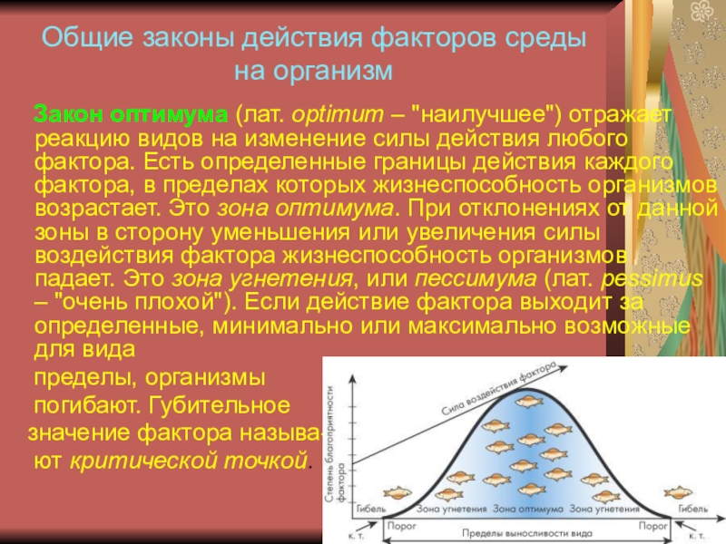optimum – "наилучшее") отражает реакцию видов на изменение силы действия любого фактора. Есть определенные границы действия каждого фактора, в пределах которых жизнеспособность организмов возрастает. Это зона оптимума. При отклонениях от данной зоны в сторону уменьшения или увеличения силы воздействия фактора жизнеспособность организмов падает. Это зона угнетения, или пессимума (лат. pessimus – "очень плохой"). Если действие фактора выходит за определенные, минимально или максимально возможные для вида