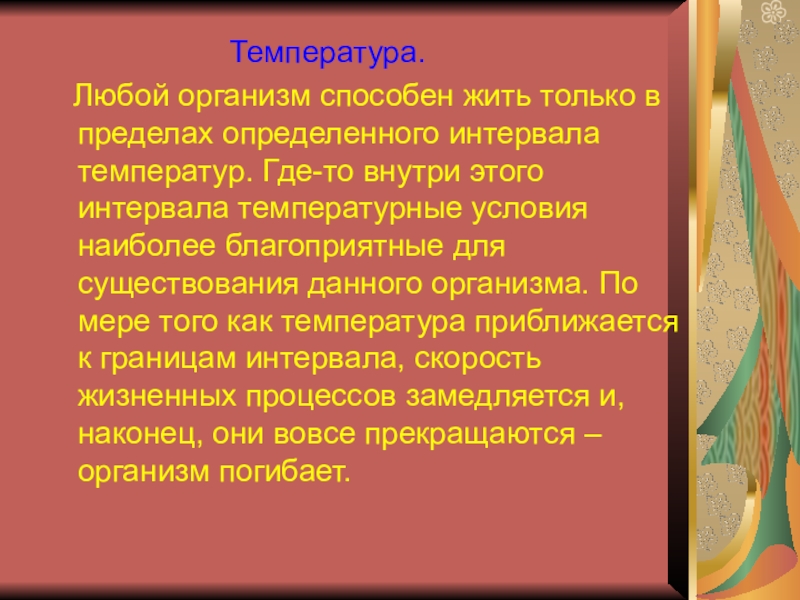 Любой организм способен жить только в пределах определенного интервала температур. Где-то внутри этого интервала температурные условия наиболее благоприятные для существования данного организма. По мере того как температура приближается к границам интервала, скорость жизненных процессов замедляется и, наконец, они вовсе прекращаются – организм погибает.