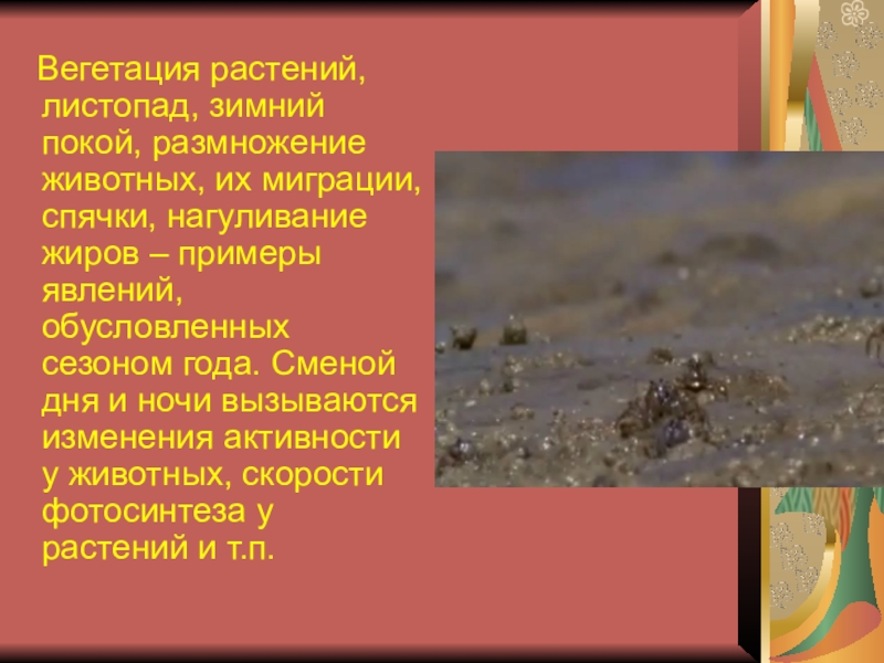 спячки, нагуливание жиров – примеры явлений, обусловленных сезоном года. Сменой дня и ночи вызываются изменения активности у животных, скорости фотосинтеза у растений и т.п.